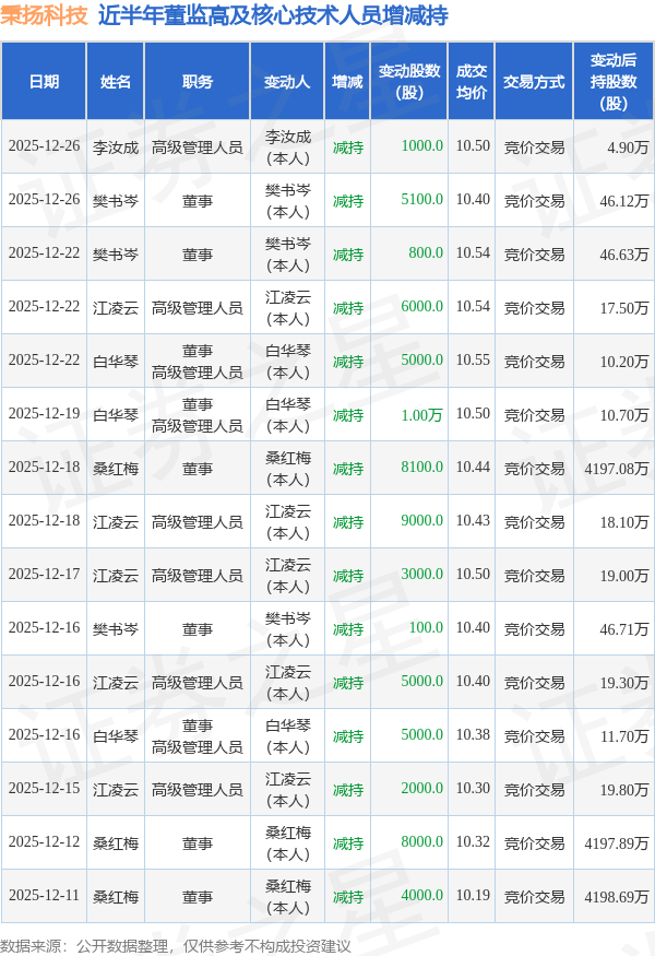 秉扬科技近半年内的董监高及核心技术人员增减持详情如下: