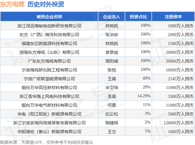 证券之星消息,根据天眼查APP显示,东方电缆(603606.SH)新增一起对外投资事件,被投资公司为浙江深远海输电创新研发有限公司,法定代表人林姚凯,投资占比为100%。该公司从事土木工程建筑业,注册资本为1000万人民币。目前,东方电缆共存在对外投资13项,详见下表: