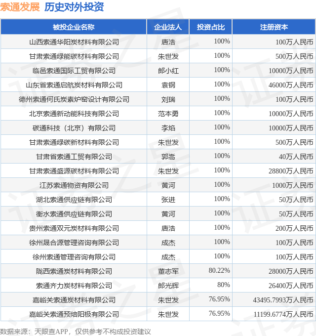 证券之星消息,根据天眼查APP显示,索通发展(603612.SH)新增一起对外投资事件,被投资公司为山西索通华阳炭材料有限公司,法定代表人唐浩,投资占比为100%。该公司从事电力、热力生产和供应业,注册资本为100万人民币。目前,索通发展共存在对外投资29项,投资占比前20的项目见下表: