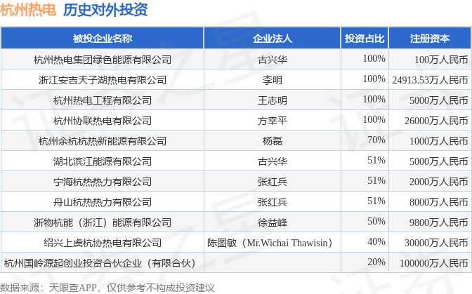 通过天眼查大数据分析,杭州热电集团股份有限公司共对外投资了17家企业,参与招投标项目746次;财产线索方面有商标信息6条,专利信息11条,著作权信息5条;此外企业还拥有行政许可31个。据2024年报数据,杭州热电长期股权投资2.5亿元,同比增3.24%。