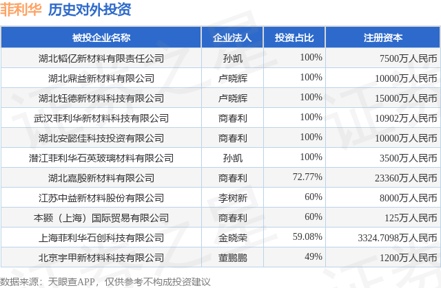 证券之星消息,根据天眼查APP显示,菲利华(300395.SZ)新增一起对外投资事件,被投资公司为湖北韬亿新材料有限责任公司,法定代表人孙凯,投资占比为100%。该公司从事非金属矿物制品业,注册资本为7500万人民币。目前,菲利华共存在对外投资11项,详见下表: