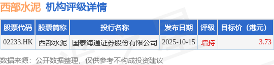 投行对该股的评级以增持为主,近90天内共有1家投行给出增持评级,近90天的目标均价为3.73港元。国泰海通证券股份有限公司最新一份研报给予西部水泥增持评级,目标价3.73港元。