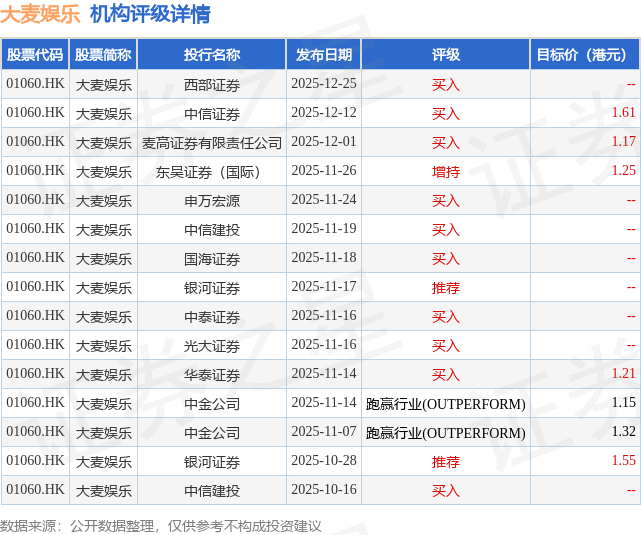 投行对该股的评级以买入为主,近90天内共有10家投行给出买入评级,近90天的目标均价为1.32港元。西部证券最新一份研报给予大麦娱乐买入评级。