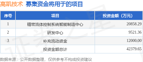 证券之星消息,江苏高凯精密流体技术股份有限公司(简称:高凯技术)拟在上交所科创板上市,募资总金额为4.09亿元,保荐机构为国泰海通证券股份有限公司。募集资金拟用于精密流体控制系统智能制造中心、研发中心、补充流动资金,详见下表: