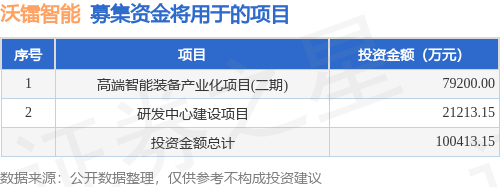 证券之星消息,杭州沃镭智能科技股份有限公司(简称:沃镭智能)拟在上交所科创板上市,募资总金额为10.04亿元,保荐机构为中信建投证券股份有限公司。募集资金拟用于高端智能装备产业化项目(二期)、研发中心建设项目,详见下表: