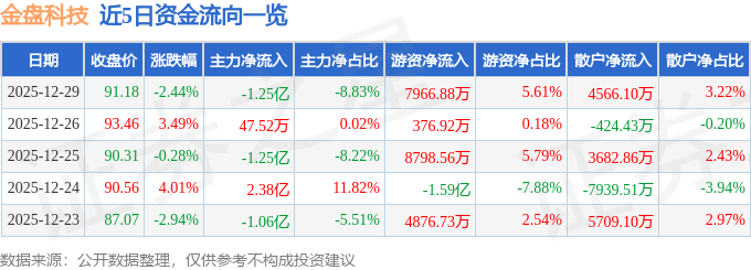 证券之星消息,截至2025年12月29日收盘,金盘科技(688676)报收于91.18元,下跌2.44%,换手率3.4%,成交量15.62万手,成交额14.2亿元。