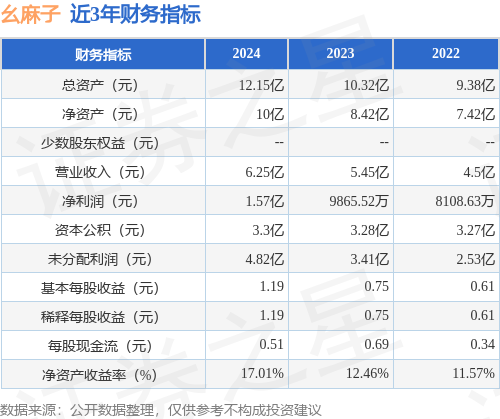 从目前公布的财报来看,幺麻子2024年总资产为12.15亿元,净资产为10亿元;近3年净利润分别为1.57亿元(2024年),9865.52万元(2023年),8108.63万元(2022年)。详情见下表: