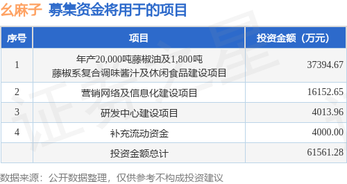 证券之星消息,幺麻子食品股份有限公司(简称:幺麻子)拟在深交所主板上市,募资总金额为5.66亿元,保荐机构为中国国际金融股份有限公司。募集资金拟用于年产20,000吨藤椒油及1,800吨藤椒系复合调味酱汁及休闲食品建设项目、营销网络及信息化建设项目、研发中心建设项目、补充流动资金,详见下表: