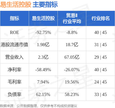易生活控股港股市值1.98亿港元,在贸易Ⅱ行业中排名第31。主要指标见下表: