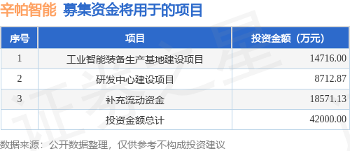 证券之星消息,上海辛帕智能科技股份有限公司(简称:辛帕智能)拟在深交所创业板上市,募资总金额为4.2亿元,保荐机构为兴业证券股份有限公司。募集资金拟用于工业智能装备生产基地建设项目、研发中心建设项目、补充流动资金,详见下表:
