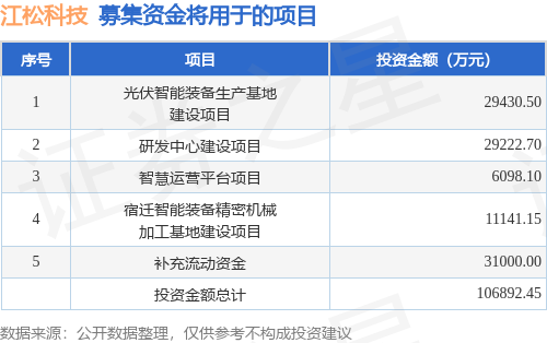 证券之星消息,无锡江松科技股份有限公司(简称:江松科技)拟在深交所创业板上市,募资总金额为10.53亿元,保荐机构为国投证券股份有限公司。募集资金拟用于光伏智能装备生产基地建设项目、研发中心建设项目、智慧运营平台项目、宿迁智能装备精密机械加工基地建设项目、补充流动资金,详见下表: