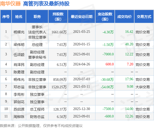 南华仪器近半年内的董监高及核心技术人员增减持详情如下: