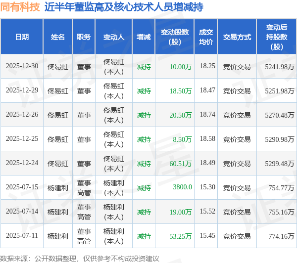 同有科技近半年内的董监高及核心技术人员增减持详情如下:
