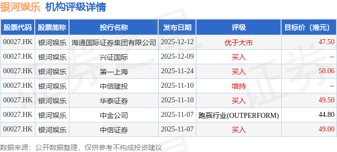 截至2025年12月31日收盘,银河娱乐(00027.HK)报收于38.32港元,上涨0.79%,成交量461.0万股,成交额1.75亿港元。投行对该股的评级以买入为主,近90天内共有4家投行给出买入评级,近90天的目标均价为48.17港元。海通国际证券集团有限公司最新一份研报给予银河娱乐优于大市评级,目标价47.5港元。