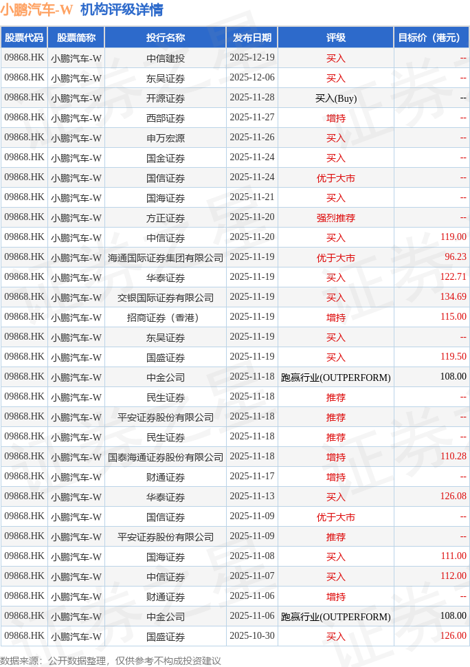 投行对该股的评级以买入为主,近90天内共有14家投行给出买入评级,近90天的目标均价为116.04港元。中信建投最新一份研报给予小鹏汽车-W买入评级。