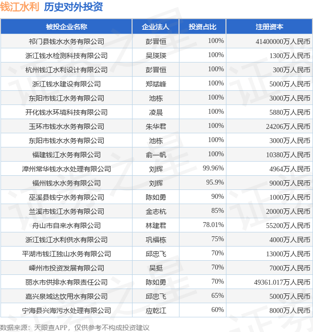 证券之星消息,根据天眼查APP显示,钱江水利(600283.SH)新增一起对外投资事件,被投资公司为巫溪县钱宁水务有限公司,法定代表人陈如勇,投资占比为90%。该公司从事水的生产和供应业,注册资本为1000万人民币。目前,钱江水利共存在对外投资30项,投资占比前20的项目见下表: