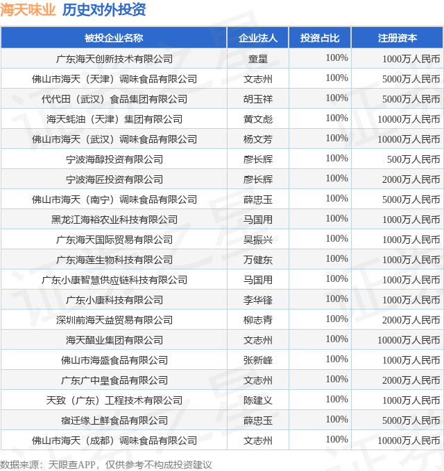 证券之星消息,根据天眼查APP显示,海天味业(603288.SH)新增一起对外投资事件,被投资公司为广东海天创新技术有限公司,法定代表人童星,投资占比为100%。该公司从事研究和试验发展,注册资本为1000万人民币。目前,海天味业共存在对外投资38项,投资占比前20的项目见下表: