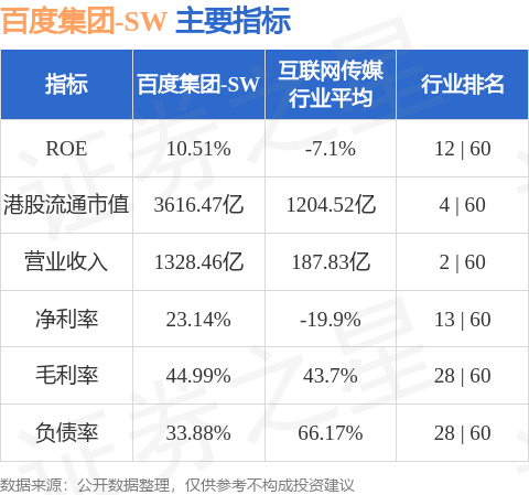 百度集团-SW港股市值3616.47亿港元,在互联网传媒行业中排名第4。主要指标见下表: