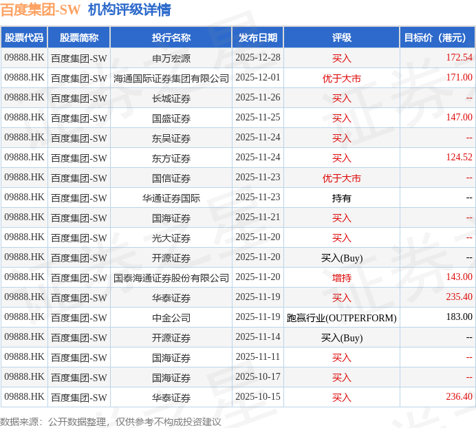 投行对该股的评级以买入为主,近90天内共有11家投行给出买入评级,近90天的目标均价为176.61港元。申万宏源最新一份研报给予百度集团-SW买入评级,目标价172.54港元。