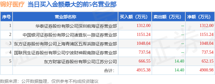 证券之星消息,沪深交易所2026年1月5日公布的交易公开信息显示,锦好医疗(920925)因当日收盘价涨幅达到20%的前5只股票登上龙虎榜。此次是近5个交易日内第1次上榜。