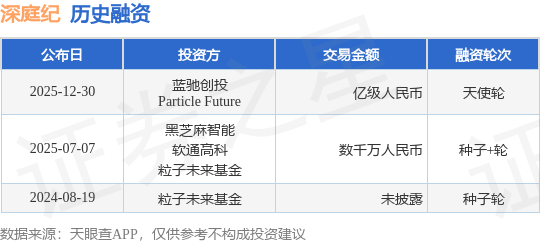 证券之星消息,根据天眼查APP于12月30日公布的信息整理,苏州深庭纪智能科技有限公司天使轮融资,融资额亿级人民币,参与投资的机构包括蓝驰创投,Particle Future。