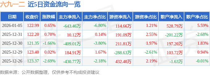 证券之星消息,截至2026年1月5日收盘,六九一二(301592)报收于122.99元,上涨0.65%,换手率3.29%,成交量7689.0手,成交额9462.21万元。