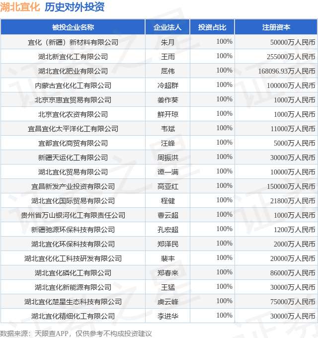 证券之星消息,根据天眼查APP显示,湖北宜化(000422.SZ)新增一起对外投资事件,被投资公司为宜化(新疆)新材料有限公司,法定代表人朱月,投资占比为100%。该公司从事研究和试验发展,注册资本为50000万人民币。目前,湖北宜化共存在对外投资34项,投资占比前20的项目见下表: