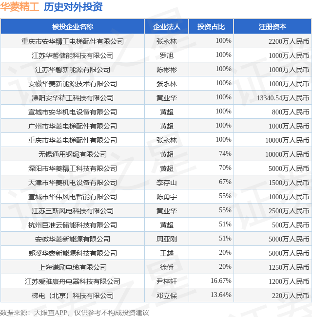 证券之星消息,根据天眼查APP显示,华菱精工(603356.SH)新增一起对外投资事件,被投资公司为重庆市安华精工电梯配件有限公司,法定代表人张永林,投资占比为100%。该公司从事通用设备制造业,注册资本为2200万人民币。目前,华菱精工共存在对外投资19项,详见下表: