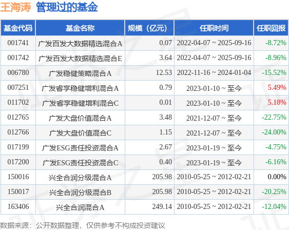 王海涛先生:工商管理硕士。历任DEC中国有限公司工程师,2003年5月至2005年7月在美国美国Business Excellence Inc.任投资经理;2005年7月至2009年10月在摩根士丹利亚洲有限公司全球财富管理部任副总裁;2009年11月至2018年9月先后任兴全基金管理有限公司基金管理部总监助理、基金经理,专户管理部副总监、投资经理,新三板部总监、投资经理。2018年9月27日加入广发基金管理有限公司,现任广发基金管理有限公司高级董事总经理、总经理助理、基金经理兼任资产管理计划投资经理。曾任广发稳健策略混合型证券投资基金基金经理。2022年4月7日至2025年9月16日任广发百发大数据策略精选灵活配置混合型证券投资基金基金经理。2023年1月10日起任广发睿享稳健增利混合型证券投资基金基金经理。