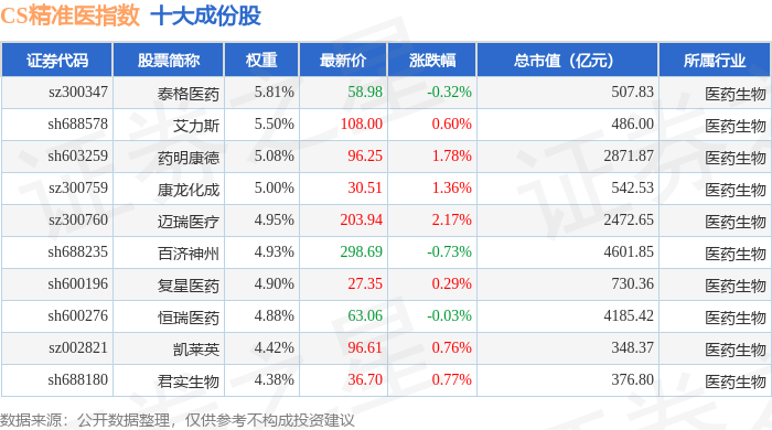 证券之星消息,1月6日,CS精准医(000863)指数报收于2818.01点,涨0.52%,成交220.48亿元,换手率1.65%。当日该指数成份股中,上涨的有23家,华大智造以6.95%的涨幅领涨,下跌的有16家,泽璟制药以3.72%的跌幅领跌。
