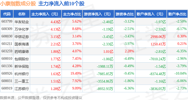 资金流向方面,小康指数(000901)成份股当日主力资金净流入合计26.83亿元,游资资金净流出合计14.56亿元,散户资金净流出合计12.27亿元。成份股资金流向详情见下表: