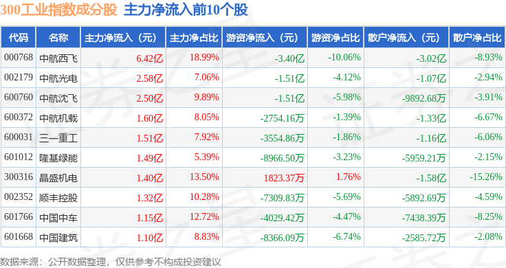 资金流向方面,300工业(000910)指数成份股当日主力资金净流出合计1.23亿元,游资资金净流出合计2.07亿元,散户资金净流入合计3.29亿元。成份股资金流向详情见下表: