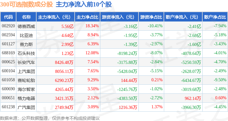 资金流向方面,300可选(000911)指数成份股当日主力资金净流入合计1.88亿元,游资资金净流出合计3.39亿元,散户资金净流入合计1.51亿元。成份股资金流向详情见下表: