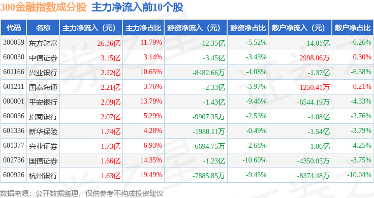 资金流向方面,300金融(000914)指数成份股当日主力资金净流入合计44.68亿元,游资资金净流出合计18.4亿元,散户资金净流出合计26.28亿元。成份股资金流向详情见下表: