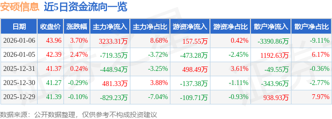 证券之星消息,截至2026年1月6日收盘,安硕信息(300380)报收于43.96元,上涨3.7%,换手率6.74%,成交量8.58万手,成交额3.72亿元。