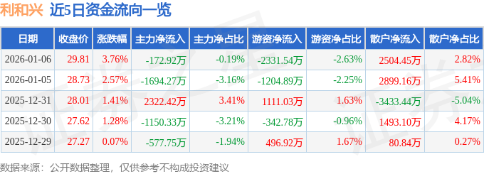 证券之星消息,截至2026年1月6日收盘,利和兴(301013)报收于29.81元,上涨3.76%,换手率16.13%,成交量30.52万手,成交额8.88亿元。