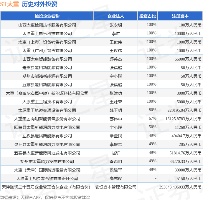 证券之星消息,根据天眼查APP显示,ST太重(600169.SH)新增一起对外投资事件,被投资公司为太重集团向明智能装备股份有限公司,法定代表人苏伟中,投资占比为67%。该公司从事金属制品、机械和设备修理业,注册资本为16125.8783万人民币。目前,ST太重共存在对外投资20项,详见下表: