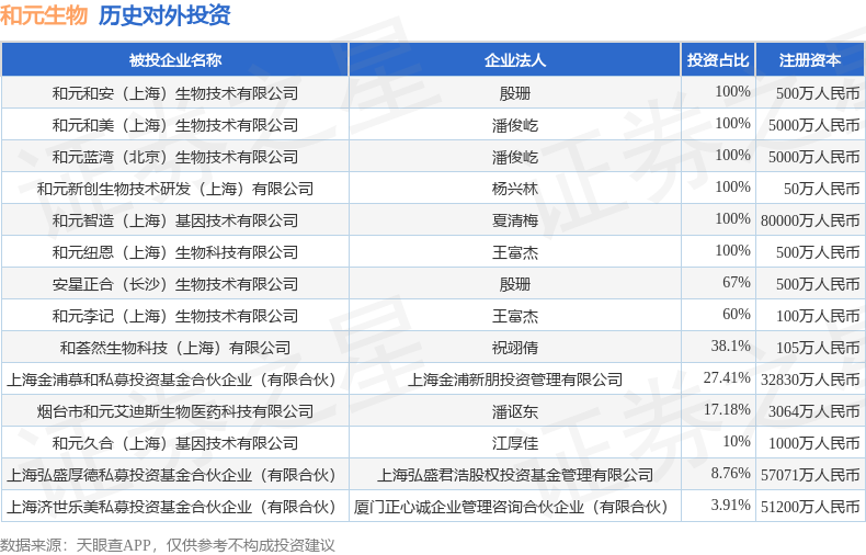 证券之星消息,根据天眼查APP显示,和元生物(688238.SH)新增一起对外投资事件,被投资公司为安星正合(长沙)生物技术有限公司,法定代表人殷珊,投资占比为67%。该公司从事医药制造业,注册资本为500万人民币。目前,和元生物共存在对外投资14项,详见下表:
