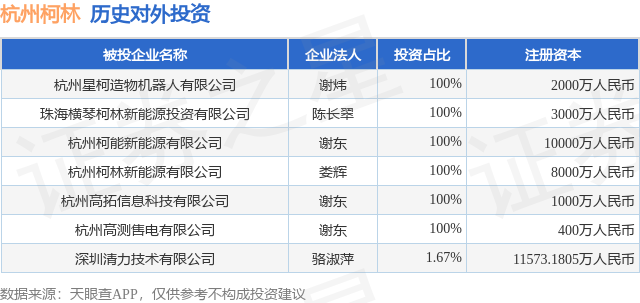 证券之星消息,根据天眼查APP显示,杭州柯林(688611.SH)新增一起对外投资事件,被投资公司为杭州星柯造物机器人有限公司,法定代表人谢炜,投资占比为100%。该公司从事计算机、通信和其他电子设备制造业,注册资本为2000万人民币。目前,杭州柯林共存在对外投资7项,详见下表:
