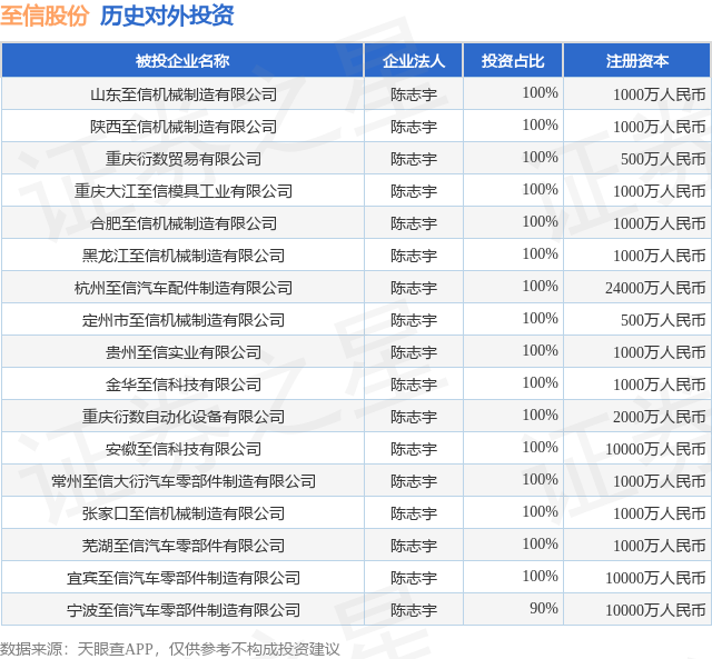 证券之星消息,根据天眼查APP显示,至信股份(603352.SH)新增一起对外投资事件,被投资公司为山东至信机械制造有限公司,法定代表人陈志宇,投资占比为100%。该公司从事汽车制造业,注册资本为1000万人民币。目前,至信股份共存在对外投资17项,详见下表: