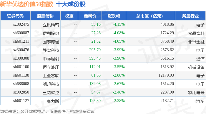 新华优选价值50(989004)指数十大成份股详情如下: