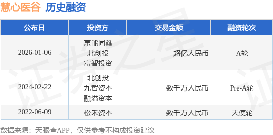 证券之星消息,根据天眼查APP于1月6日公布的信息整理,北京慧心医谷生物科技有限责任公司A轮融资,融资额超亿人民币,参与投资的机构包括京能同鑫,北创投,富智投资。