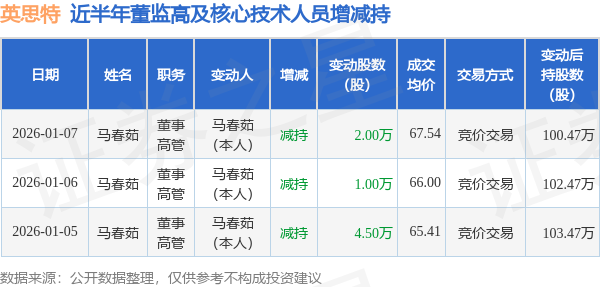 证券之星消息,根据1月8日市场公开信息、上市公司公告及交易所披露数据整理,英思特(301622)最新董监高及相关人员股份变动情况:2026年1月7日公司董事,高管马春茹共减持公司股份2.0万股,占公司总股本为0.0173%。变动期间公司股价上涨1.41%,1月7日当日收盘报67.01元。