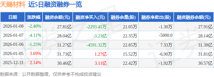 天赐材料融资融券信息显示,融资方面,当日融资买入4.19亿元,融资偿还4.42亿元,融资净偿还2293.41万元。融券方面,融券卖出6700.0股,融券偿还1.97万股,融券余量21.05万股,融券余额934.62万元。融资融券余额27.91亿元。