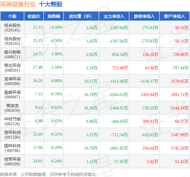 个股表现方面,环保设备行业当日领跌股为恒合股份(920145),该股当日报收21.15,下跌4.56%,成交量3.26万,主力资金净流出1507.94万元。恒合股份(920145)以下跌4.56%紧随其后,该股当日成交量3.26万,主力资金净流出1507.94万元。除此之外,碧兴物联(688671)、青达环保(688501)、龙净环保(600388)均进入当日熊股之列。具体个股列表见下表: