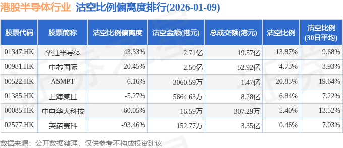 从沽空比例偏离度来看,华虹半导体、中芯国际、ASMPT沽空比例偏离度位居行业前三,分别为43.33%、20.45%、6.16%。