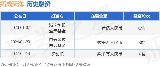 证券之星消息,根据天眼查APP于1月7日公布的信息整理,广东拓威天海科技股份有限公司C轮融资,融资额近亿人民币,参与投资的机构包括浙商创投,空天基金。