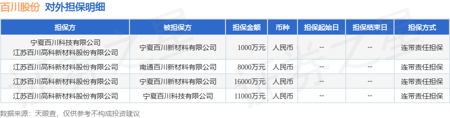 百川股份1月8日披露4笔对外担保,被担保公司3家。对外担保明细如下表: