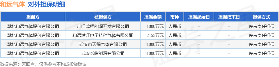 和远气体1月8日披露4笔对外担保,被担保公司4家。对外担保明细如下表: