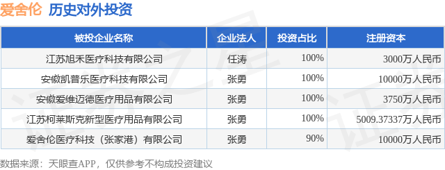 证券之星消息,根据天眼查APP显示,爱舍伦(920050.BJ)新增一起对外投资事件,被投资公司为江苏旭禾医疗科技有限公司,法定代表人任涛,投资占比为100%。该公司从事其他制造业,注册资本为3000万人民币。目前,爱舍伦共存在对外投资5项,详见下表: